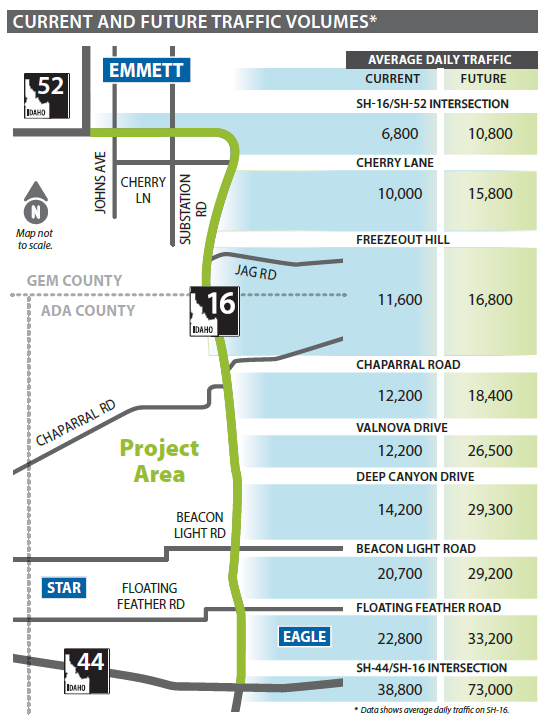Purpose: The purpose of this project is to meet capacity ​and safety requirements on SH-16, from its intersection ​with SH-44 to SH-52 in Emmett, based on the projected ​2050 traffic volumes.